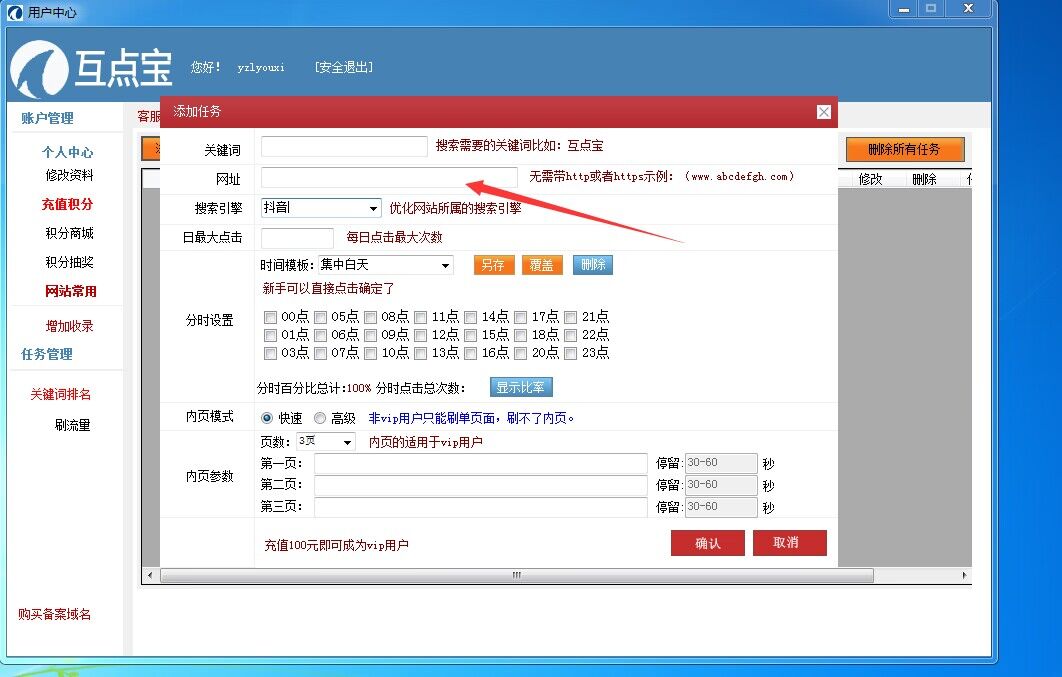 首先进入互点宝后台,进入抖音排名添加关键词和抖音链接就行,点击数量100次即可。